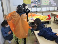 4年生はいくつかの場所に分かれて、送る会の練習をしていました。制作組も家庭科室で衣装や大道具などを作っていました。多分劇らしきものだと思います。楽しみです。
