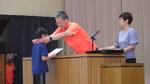 朝のモジュールの時間に保護者会から全校児童にTシャツのプレゼントがありました。このTシャツは、「創立50周年」を迎える記念Tシャツです。児童会の代表が受け取り、全校児童へ配られました。早速、着ている児童がいたりと、とても喜んでいました。ありがとうございました。