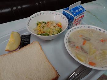 ★すいとん汁は、すいとんに加え多くの野菜が入っていましたが、出汁のきいた濃いめの汁なので、とてもおいしくいただきました。鮭もやわらかくマヨネーズソースが良く絡んで食べやすかったです。みかんがとても甘くて、より一層秋の深まりを感じました。