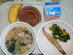 野菜たっぷりラーメン ココアカップケーキ ししゃもの胡麻焼き 小松菜ソテー バナナ 牛乳