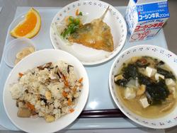 炊き込みご飯 鯵の南蛮漬け なめこと豆腐の味噌汁 きなこナッツ オレンジ 牛乳