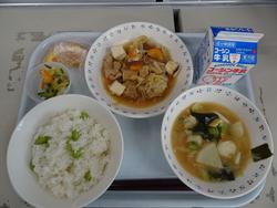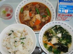 じゃこと小松菜のご飯 生揚げと豚肉の味噌煮 かき玉汁 紫陽花ゼリー 牛乳
