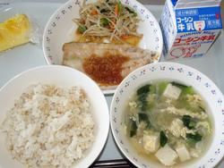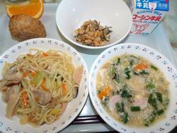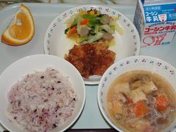 五穀米入りご飯 チキンカツ 野菜炒め のっぺい汁 甘夏 牛乳