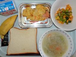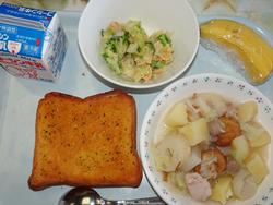 食パン ブルーベリージャム サケのポテサラ焼き 枝豆サラダ アルファベットスープ バナナ 牛乳