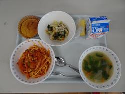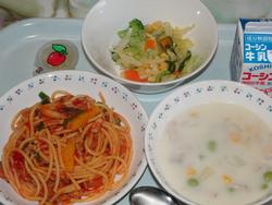 トマトとツナのスパゲッティ キャロットアーモンドケーキ じゃこサラダ コーンスープ パインアップル 牛乳