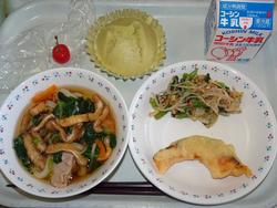 五目うどん 小豆抹茶蒸しパン カボチャの天ぷら アーモンド和え さくらんぼ 牛乳