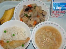 グリンピースご飯 わかさぎフリッター 沖縄風煮しめ 味噌汁 バナナ 牛乳