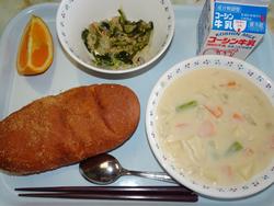 きなこ揚げパン アスパラシチュー 海藻サラダ オレンジ 牛乳