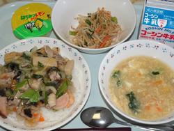 中華丼 もやし胡麻酢和え 中華玉子スープ はちみつレモンゼリー 牛乳
