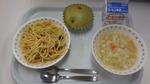 焼きそば わかさぎフリッター ワンタンスープ みかんゼリー 牛乳