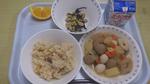 茶飯 おでん 浸し青豆 オレンジ 牛乳