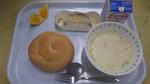 今日はお話給食2回目です。『せかいいちおいしいスープ』という絵本を読んでくれました。ハーブ焼きのバジルの風味が甘いパンと合っていました.