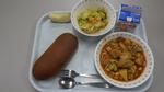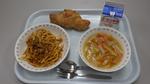ピリッと和えはきゅうり、大根、パプリカの和え物で彩りがよくさっぱりとしていて美味しかったです。焼うどんに蒸しパンとボリュームたっぷりの給食でした。