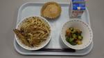 焼うどん ししゃもの胡麻揚げ 三色野菜のピリッと和え きな粉蒸しパン 牛乳