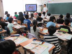 5年生は、外国語の授業中。 国語でも外国語でも、自分の思いを伝える学習を行っています。 |