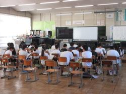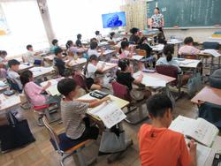 3年生は国語の学習中。 先生の話を聞いて、黒板の内容をノートに写しています。 |