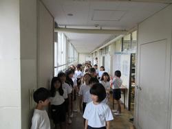 3年生が発育測定を行っています。次のクラスも、静かに並んで保健室に移動します。 |