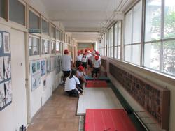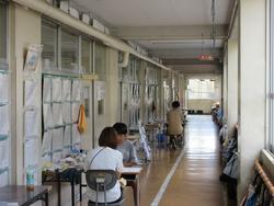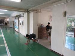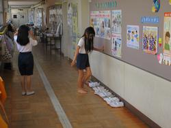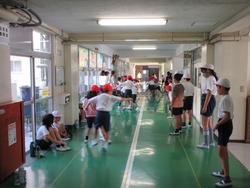 ただ今、体育館が空調工事で使えないので、体力テストを廊下で実施しています。 | |