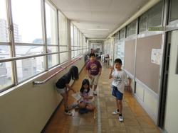 3年生の理科で、ゴムの力を使って車を走らせています。 廊下のマス目を数えながら走行距離を測定しています。 |