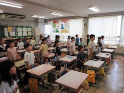 1年生、1時間目の授業が始まります。 号令がかかっているときに、背筋を伸ばして挨拶をします。 |