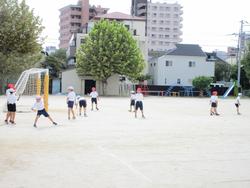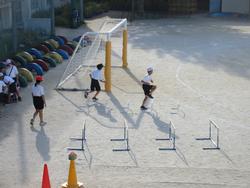 1年生の、体力テストの手伝いを6年生が行っています。 反復横跳びの回数を数えながら、「頑張れー!」と応援していました。 |