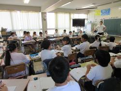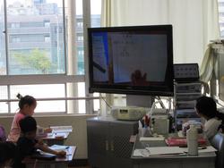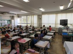 4年生は、国語の授業で漢字の組み立てを行っています。 コの字型の机の隊形になっており、発表している友達をクラス全体で見ることができています。 |