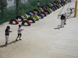 外では、4年生が空気てっぽうを撃っています。 「ポンッ」と、いい音が校庭に響き渡っていました。 |