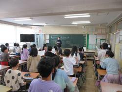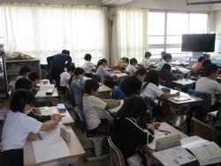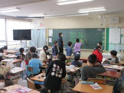 今日は2年生の教室に、他の小学校と中学校から先生方が研修でやってきました。 先生方に、九九の暗唱を聞いてもらっています。 |
