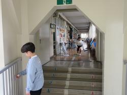 1年生が図書室へ向かいます。 カメラに気付くと、おすまし顔できちっと並びます(笑)。 |