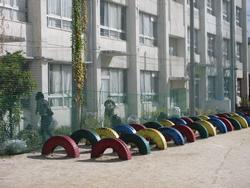 輪投げゾーンでは、先生方の的をめがけて輪っかを投げます。 たくさん入ったようで、大喜びです! |