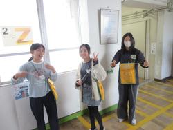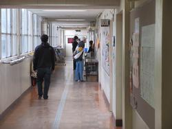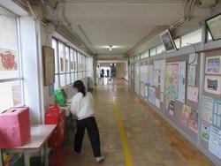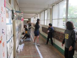 掃除の時間です。 職員室前を3年生が箒で掃いています。ながーい廊下ですが、分担して取り組んでいました。 |