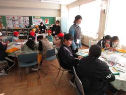 2年生は明日の校外学習に向けて、しおりの読み合わせ。 表紙の絵をきれいに塗っています。 |