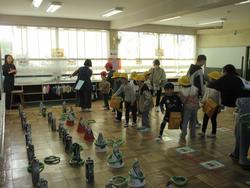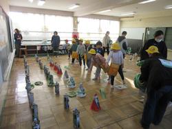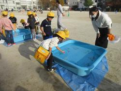 校庭では、おはじきを水中に入っているコップめがけて落としていきます。 簡単なようで、なかなか難しいようです。 |