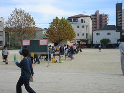 校庭の真ん中では、靴飛ばしを行っています。 「あーした天気になーれ!」の掛け声のもと、力いっぱい靴を飛ばします。 |