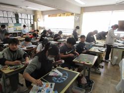 6年生は、図工で絵画に取り組んでいます。 色画用紙に、絵の具で色を載せています。さすが6年生、想像力豊かな絵が、出来上がってきています。 |