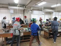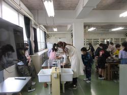 隣のクラスは、理科室で実験中。 鉄を温めて膨張させる実験に取り組んでいます。輪っかに鉄の玉が引っかかると 「おー」と驚きの声が上がりました。 |