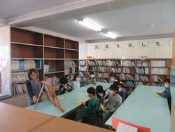 図書室では、図書の先生が読み聞かせを行っています。 大きな絵本で、子ども達も物語に引き込まれています。 |