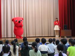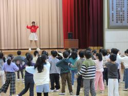 今日は、1年生から3年生までの子ども達対象に、 チーバ君と一緒にダンスを踊りました。 はじめにお姉さんが、ダンスの振付を教えてくれます。 |