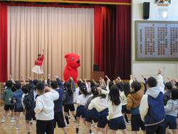 恥ずかしそうだった子ども達も、少しずつ振付が大きくなってきています。 最後は、チーバ君登場!一緒に楽しくダンスを踊りました。 |