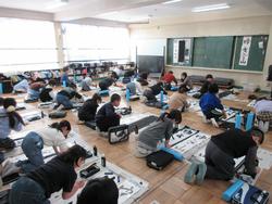 3年生は、集会室で書初めの練習を行っていました。 だるま筆を使って、書き初め用紙に大きく書き上げています。 |