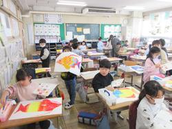 全学年、大きな画用紙に描く絵画に力を注いでいます。 2年生、色鮮やかに海の生き物を描いています。 |