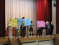 1月の生活目標について、保健委員会が劇で伝えてくれました。 「しっかり手洗い」「よく寝る」「朝ご飯を食べる」 3つのことを守って、元気に過ごしていきましょう。 |