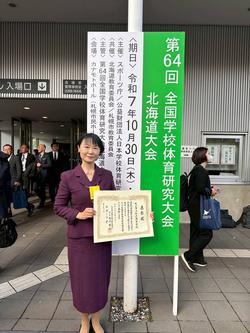 本校は令和4年度から令和6年度の3年間千葉県教育委員会から学校体育研究指定校として指定され、「男女共習における主体的、対話的で深い学びを促す『AARサイクル』と『ゲーム中心の指導アプローチ』の活用と支援の研究」を研究主題として研究を行いました。令和5年度には千葉県学校体育研究大会にて研究における公開授業も実施しました。この3年間の研究への取り組みと成果が評価されて、このたび全国学校体育研究優良校として表彰されることになりました。 10月30日に開催された第64回全国学校体育研究大会北海道大会にて表彰式があり、勝又英子校長先生が表彰式に参加してきました。 全国学校体育研究優良校 市松!! |