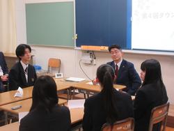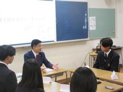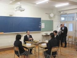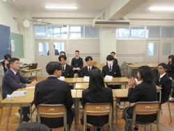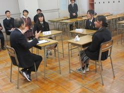 松戸市の波田教育長が来校し、本校の生徒と学校生活等について意見交換を行いました。意見交換は、オーストラリア短期研修に参加した3年生3名と生徒会役員の3名が参加しました。 波田教育長からは、「海外研修を振り返ってみてどうか」という質問に、参加した生徒からは、「今思うとあっという間。残りの高校生活を大切にしていきたい」と返答していました。また、生徒会の生徒とのやりとりでは、生徒会のあり方について意見が交わされ、教育長からは3層構造が大切。理念、目標、そして具体。「相手の考えを引き出しながら合意形成をしていくことが大切」、「好きなことを楽しく」と素敵な言葉をいただきました。 今回の意見交換で得たことを周りに波及させていきながら、一人ひとりの学校生活をさらに充実させていきたいものです。波田教育長、ありがとうございました。 教育長と語る市松の未来!! |