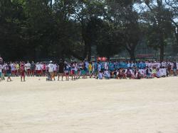 | 全校生徒が体育館に集合! 色とりどりのクラスTシャツが 開会式に花を添えます。 |