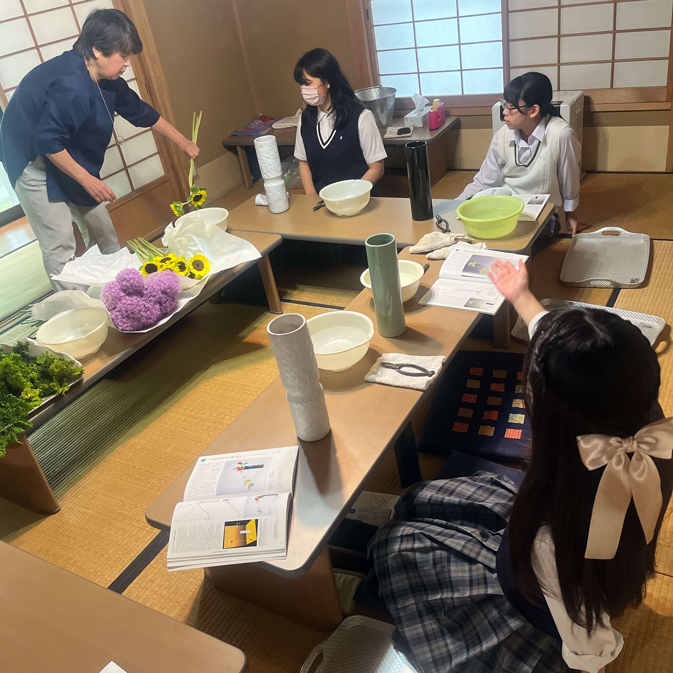 6月11日にオーストラリアから短期留学生が来校し華道を体験することになったので、きちんと教えられるよう本日も練習に励みました。本日は先生方もお招きし、本番に向けて教える練習を行いました。
