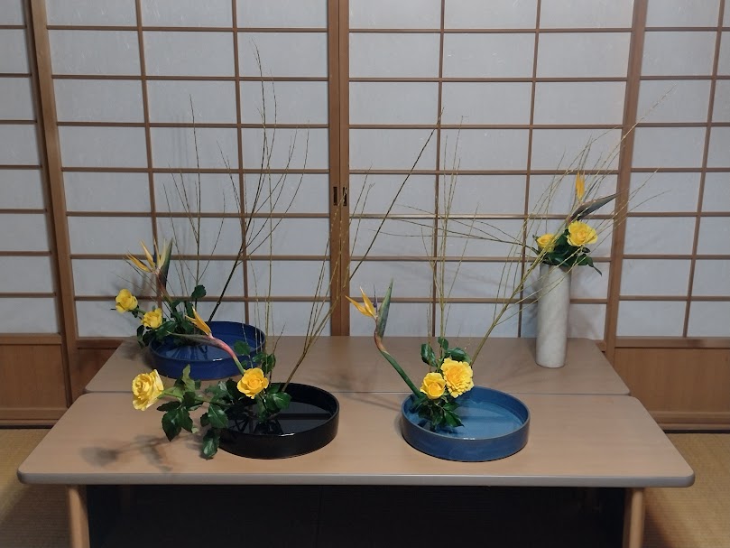 水盤と花瓶の両方で練習です。枝を挿したら花を入れます。