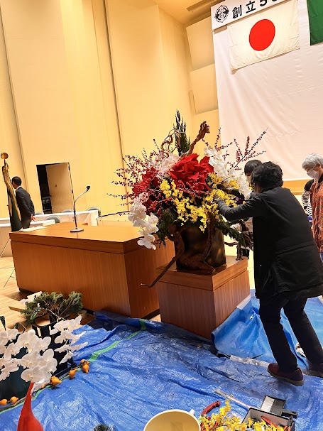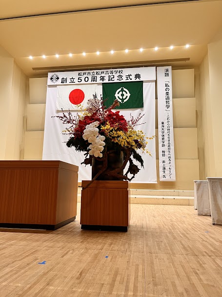 松戸市立松戸高等学校が今年で創立50周年を迎えるということで、記念式典用に華道の先生方4人がかりで大作を作っていただきました。制作時間5時間!!胡蝶蘭を基調とした作品で、非常に豪勢な仕上がりに華道同好会一員とても感動しました!