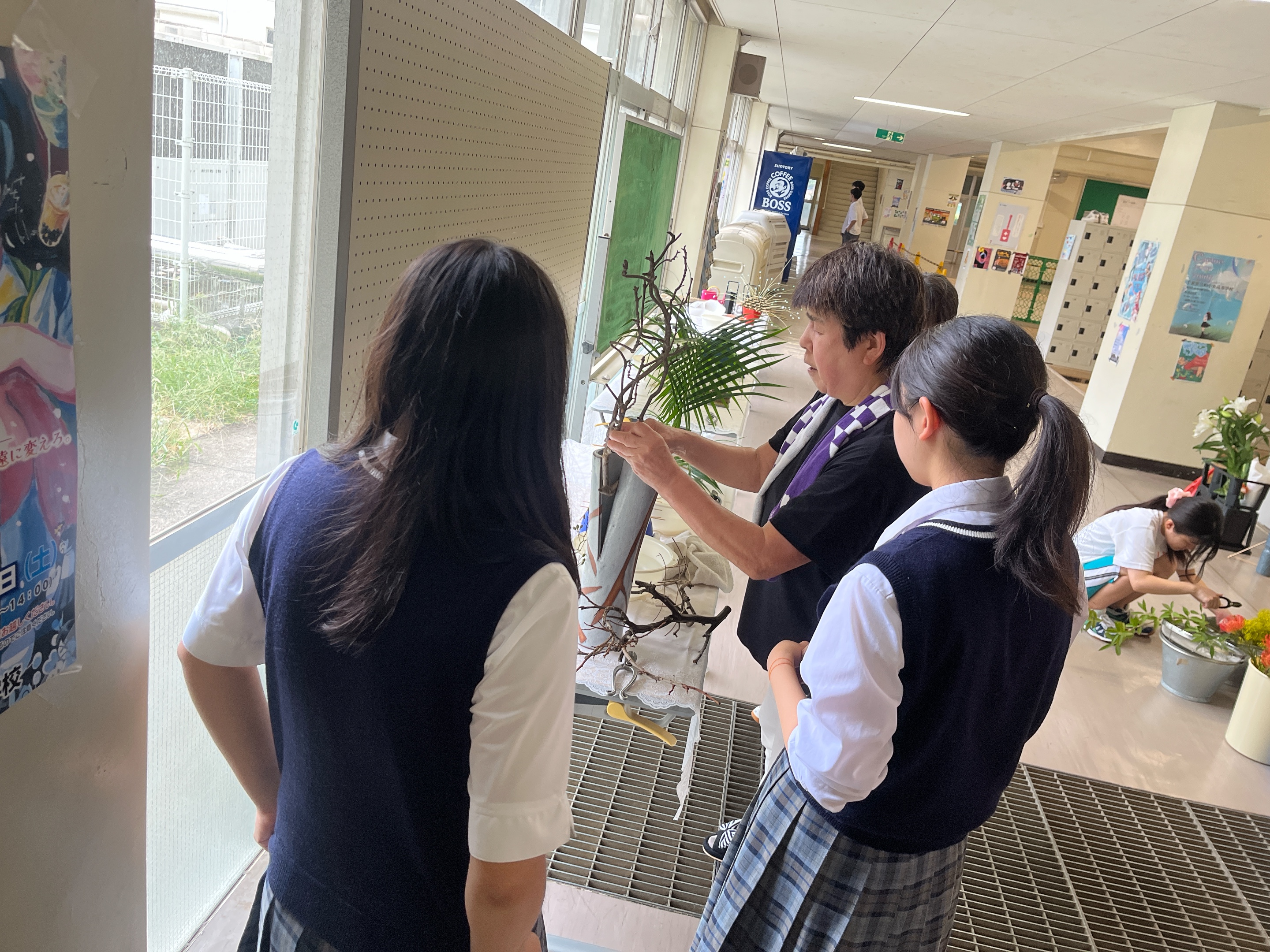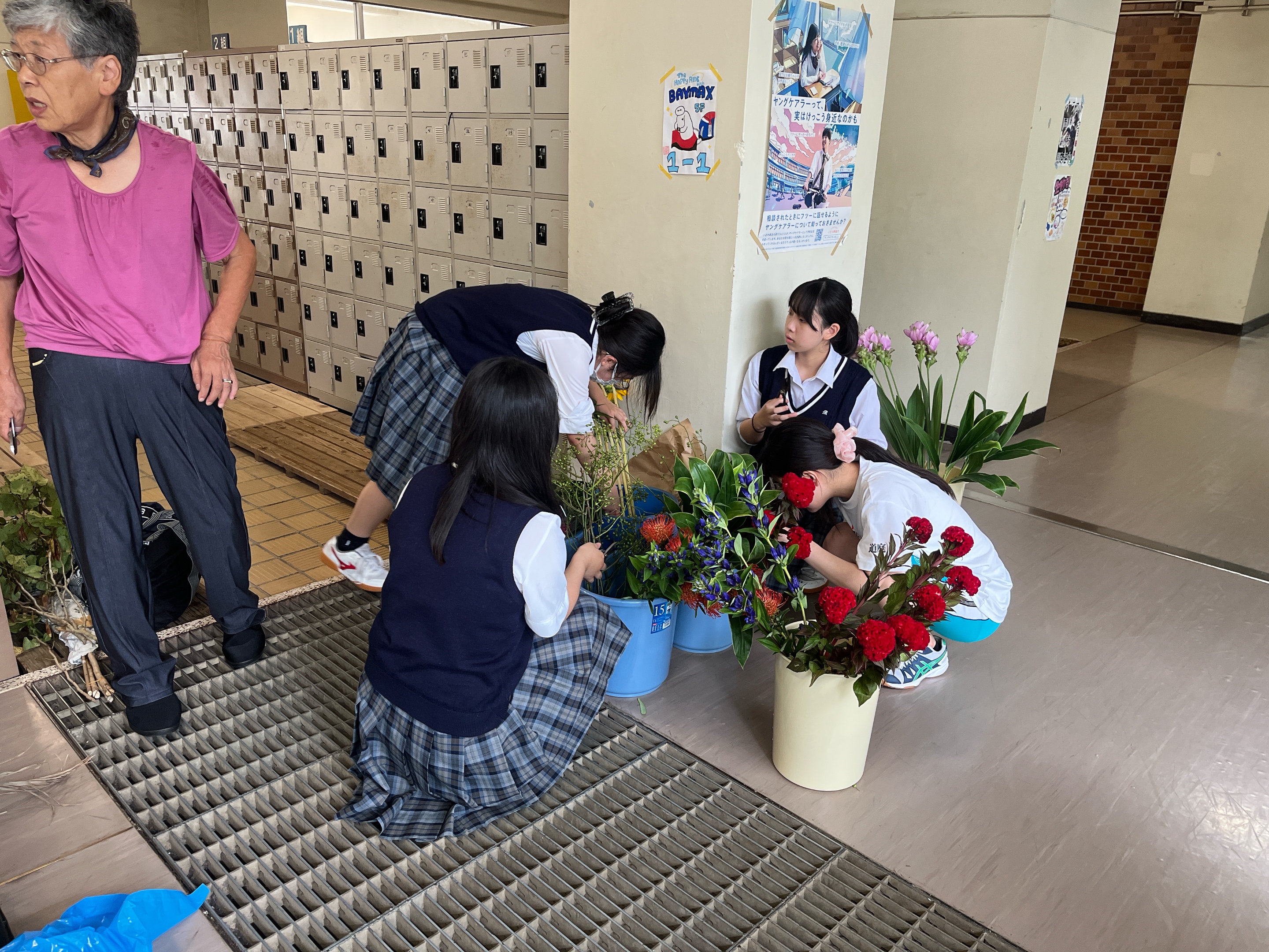 式後は小さな花瓶に移し替え、生徒や先生方、来校された方々などたくさんの人に見てもらえるように教室や廊下、職員玄関などに飾り付けました!