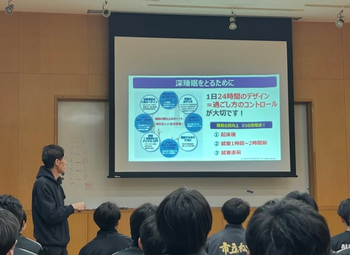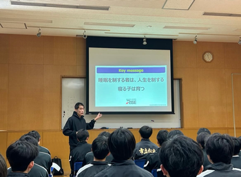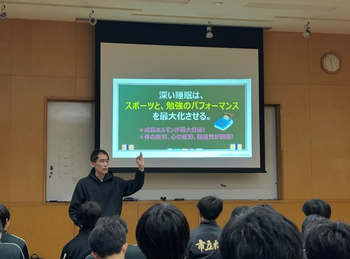 ライズ東京 宮崎社長を本校にお招きして睡眠セミナー、寝るトレセミナー&体験会を実施していただきました。人生の3分の1は睡眠時間です。その睡眠の質を上げるための方法だったり、睡眠の効果というものを改めて知り、とても有意義な時間となりました。大谷翔平選手は1日10時間必ず寝る、青山学院大学の選手は平均9時間睡眠など結果を出している選手たちはとても睡眠を大切にしていて、トレーニング以前に差がついていることを再確認しました。私たちもRiseとともに睡眠の質を向上させ、夢を実現できるように頑張ります。